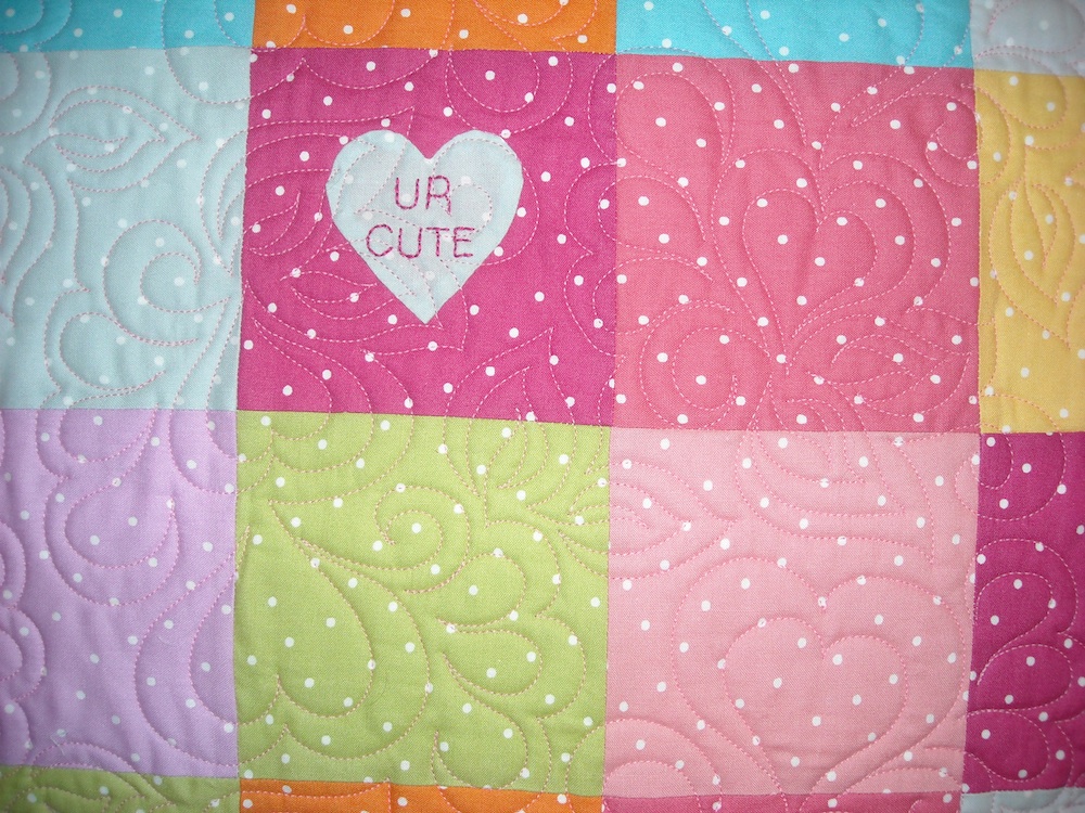 With all the colors of a bag of candy hearts, it’s a bright shot of color in the middle of winter. My world has been looking pretty gray lately, so working on this happy, bright quilt was fun.